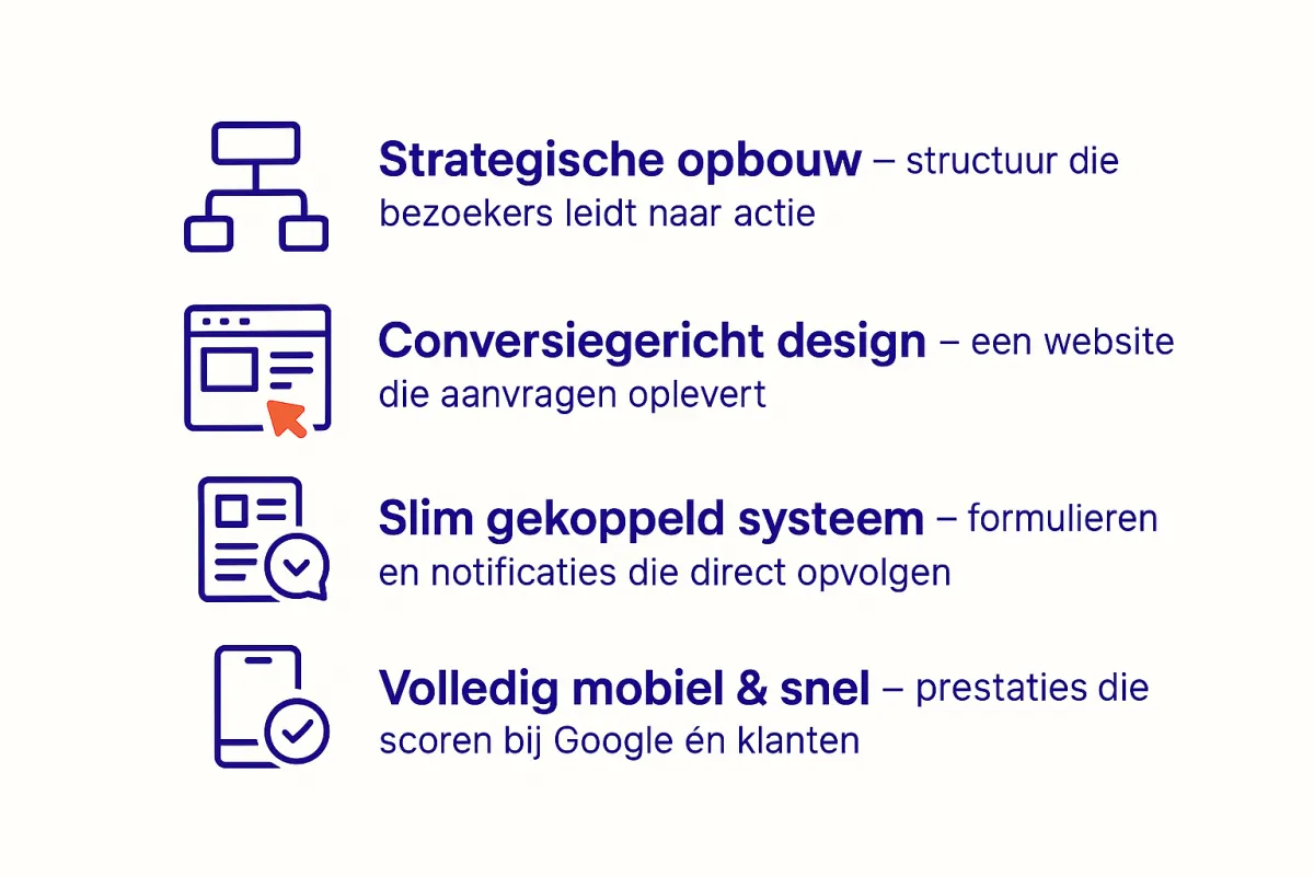We bouwen websites met een duidelijke strategie achter elke klik. De opbouw leidt bezoekers stap voor stap naar actie, met een design dat vertrouwen wekt én converteert. Achter de schermen koppelen we slimme formulieren en automatische notificaties, zodat aanvragen direct worden opgevolgd. Elke website is volledig mobiel, razendsnel en technisch geoptimaliseerd voor Google — zodat jij niet alleen online staat, maar ook gevonden wordt door de juiste klanten.
